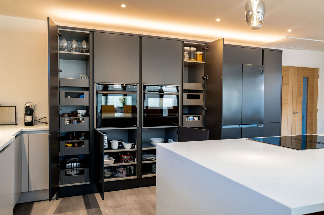- Handles: Handleless rail in Graphite and Aluminium